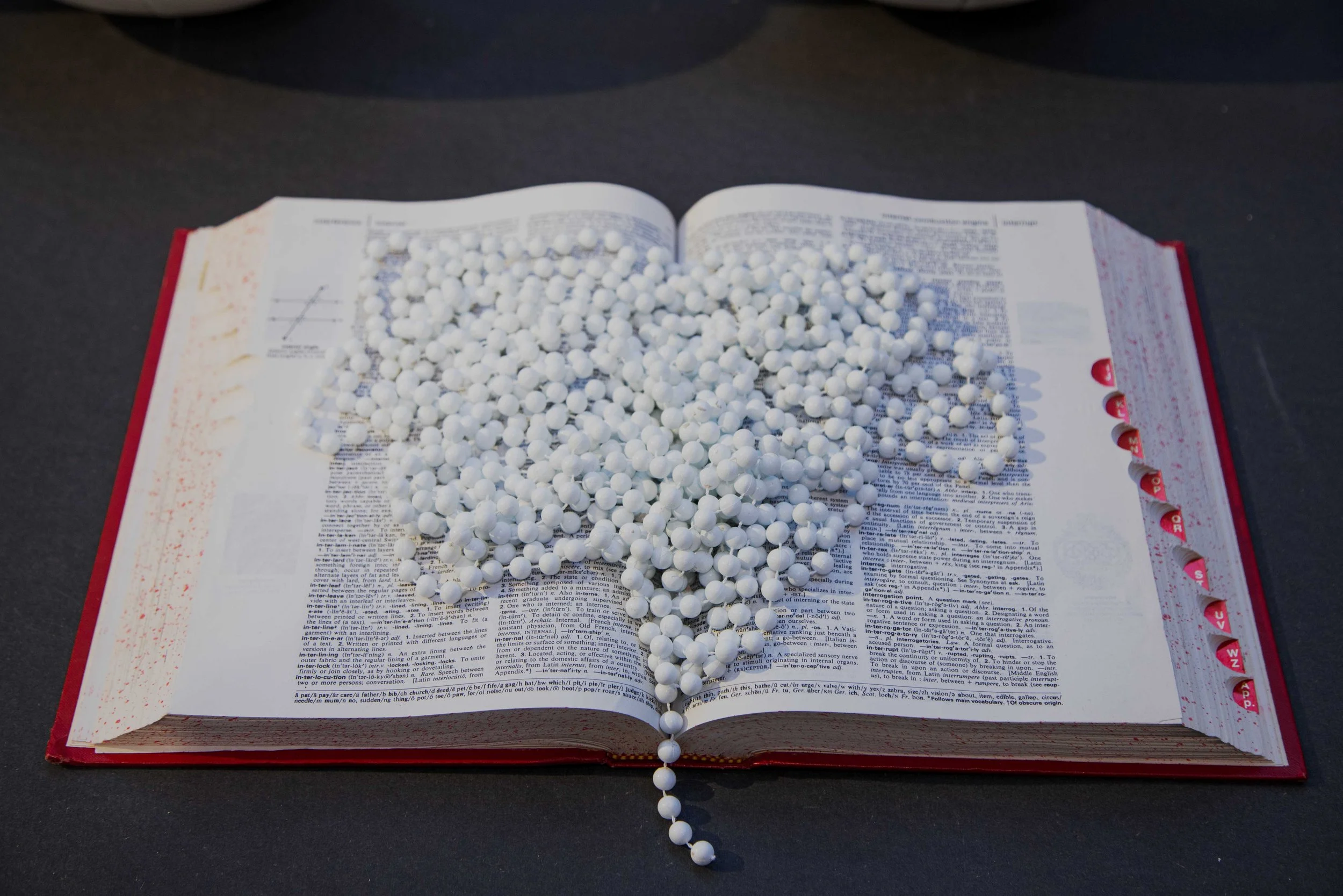 Curved wood lathes, wax, screw eye hooks, plaster, flower fakir, shells, rodent net, casted glass, ball chain, American dictionary, raw sugar, found mirror, bird bone, desert sand, test tube, silicon, lab glass, thistle seeds, 150 apple seeds, 150 metal pins, wax, snakeskin, plastic pockets, thread, fossil vitra, ashes from iris, glass, cast sugar, glass bead